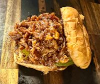 BBQ Beef Sandwich includes a buttered toasted bun, sirloin beef, sweet bbq sauce, shredded cheese and pickles. You can removed the cheese or pickles. You can add other items from below.